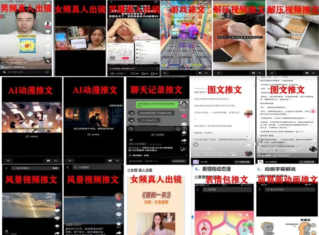 常见的小说推文赛道有:聊天记录推文、游戏推文、图文推文、解压视频推文、风景视频推文、表情包推文、AI动漫推文、沙雕动画推文、沙雕简易动画推文、真人出镜推文、真人特效出镜推文等等。