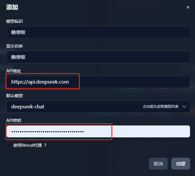 前面两个随便取,API地址如果你使用deepseek就用下面这个,https://api.deepseek .com