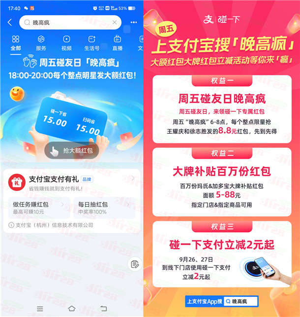小编提示:打开“支付宝”APP搜索【晚高疯】进去,今天18点至20点,每个整点抢8.8元碰一下红包,还有百万份免单,每个整点数量限量,另外,9月26日、9月27日这两天,在任意线下门店使用碰一下支付立减2元起