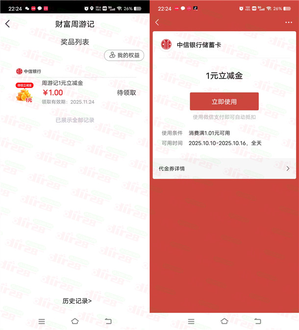 参加中信银行举办的财富周游记抽最高500元微信立减金活动,这个活动注册过中信银行二类电子卡的都可以去,通过打开“中信银行”APP,首页点【做任务抽大奖】进去,完成2个简单的浏览任务抽奖,有机会中到1-500元微信立减金,小编测试中到1元秒到。