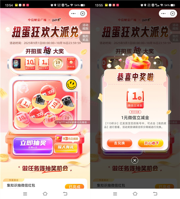 中信银行扭蛋狂欢抽1-100元微信立减金、京东卡 亲测中3元