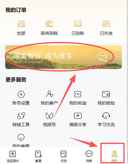 授权成功登录后,点击我的,点击中间绑定微信推客,完成即可