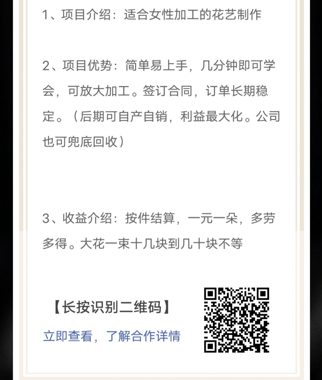正文 手工永生花!易上手。人均260+ rnm22222 V评论者 /昨天 /0 评论 /93 阅读 1001 1、项目介绍:适合女性加工的花艺制作!2、项目优势:简单易上手,几分钟即可学会,可放大加工。签订合同,订单长期稳定。(后期可自产自销,利益最大化。公司也可兜底回收)3、收益介绍:按件结算,一元一朵,多劳多得。大花一束十几块到几十块不等【长按识别二维码】立即查看,了解合作详情投诉/删帖