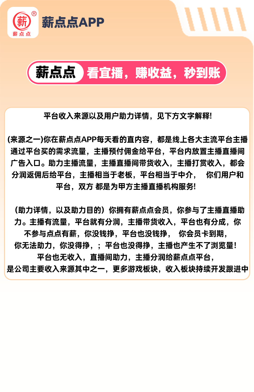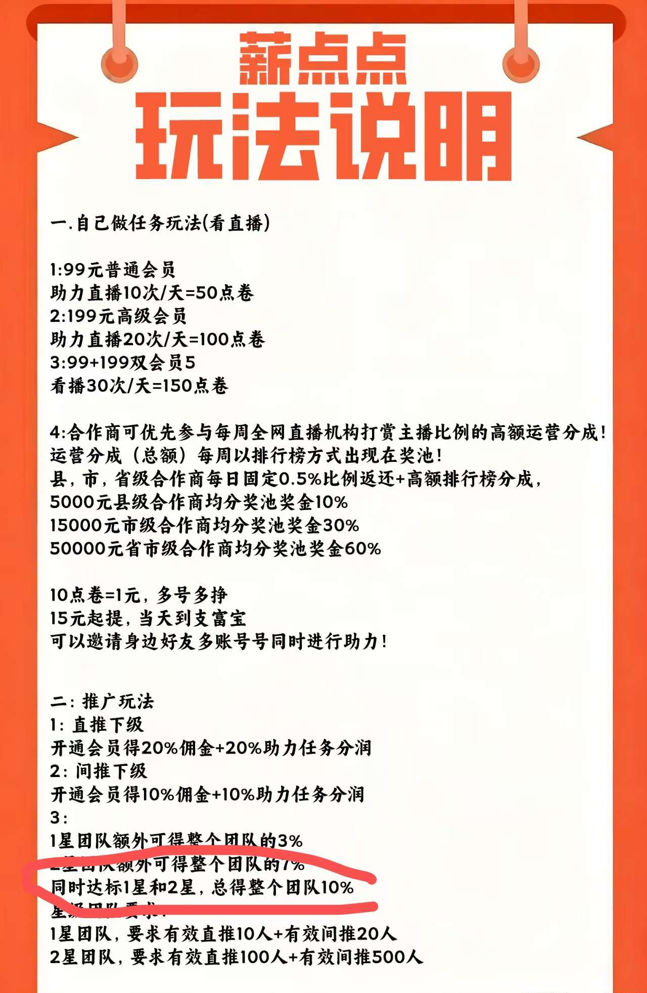 正文 薪点点首码分享!看播3分种=15元到账 首码联盟 V评论者 /今天 /0 评论 /92 阅读 1009 全网首发《薪点点》,每天看看直播助力即可,日看播3分钟收益15元兜底,提现秒速到,赶紧上车致富。薪点点攻略:1:白银会员每天看播得5金币=5元2:199会员:每天看播的15金币=15元3:成为区域合作商享受排行榜分紅推广收益简介:1.直推20%佣金➕20%每天助力分润2.间推10%佣金➕10%每天助力分润3.上星级芜限级团队收益1星3%➕2星7%=10%提米说明:满15元起提到支付宝,多劳多赚,火速开干! 投诉/删帖