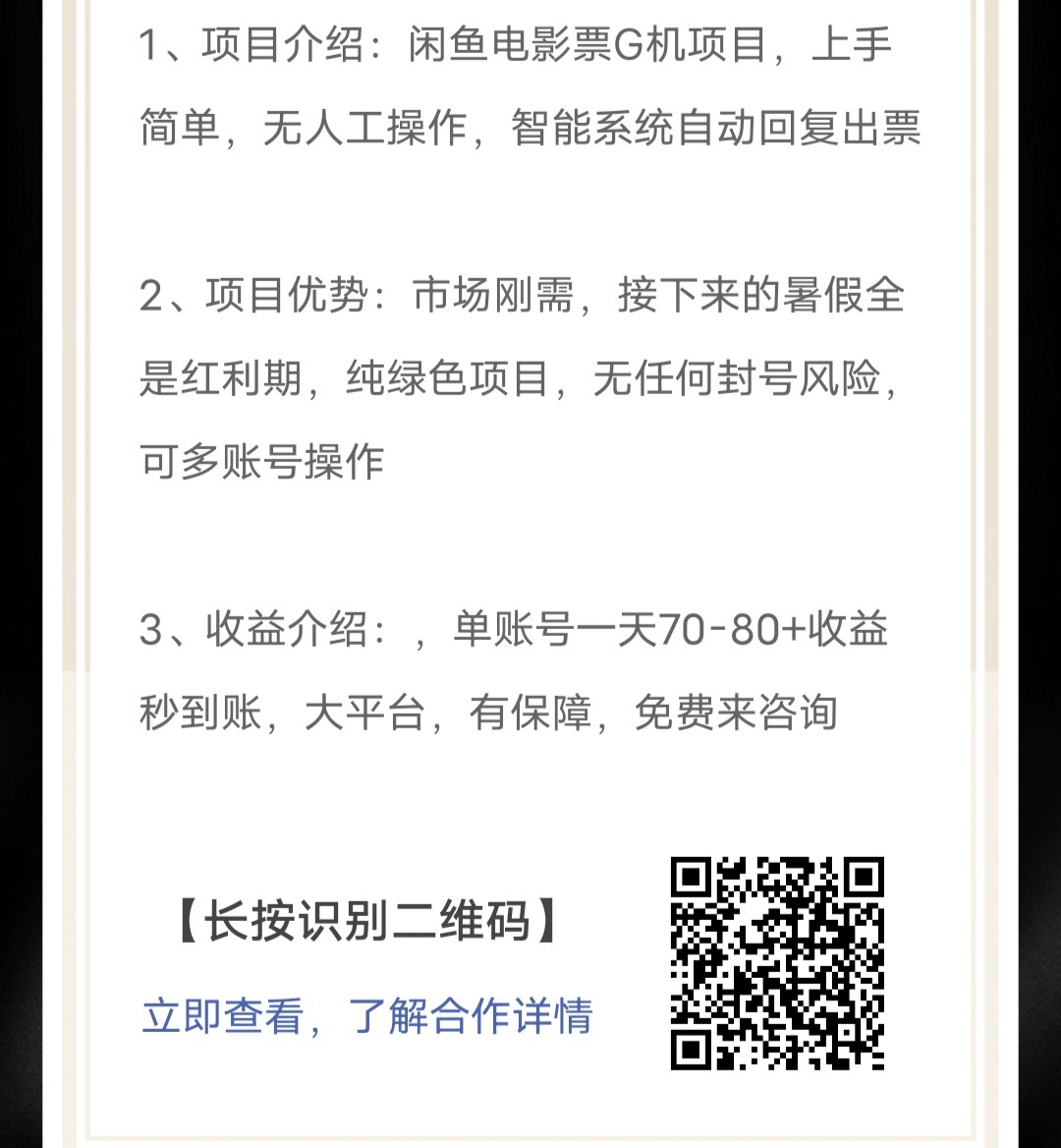 正文 (闲鱼自动化电影票G机项目,单账号日收益100十,刚需市场,收益秒到账!! rnm22222 V评论者 /今天 /0 评论 /92 阅读 1013 1、项目介绍:闲鱼电影票G机项目,上手简单,无人工操作,智能系统自动回复出票!2、项目优势:市场刚需,接下来的暑假全是红利期,纯绿色项目,无任何封号风险.可多账号操作!3、收益介绍:,单账号一天70-80+收益秒到账,大平台,有保障,免费来咨询!【长按识别二维码】立即查看,了解合作详情投诉/删帖