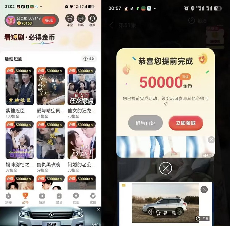 小金牛短剧看一部剧有5W金币=5块~缇米也是很方便,满0.3即可缇米,这个时候我们先看必得这里的金币,刚开始都是没有5W的哈,这个不用着急必得这里金币没有5W不要着急点进去看剧哈,我们点击必得旁边的短剧随便找一部剧或者找自己喜欢的剧去看,前面几集是免费的,后面的集数就需要我们看广解锁剧情了,这就是金币的来源。