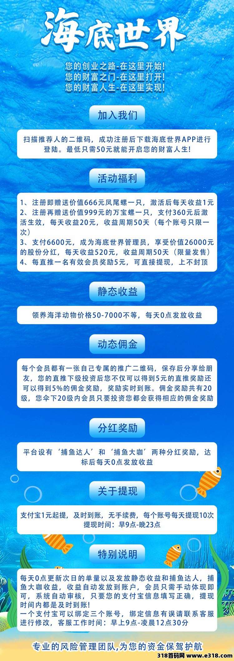 海底世界首码上线,全民养鱼的时代已经来临,你还在等什么?注册成功后赠送价值666元的凤尾螺一只,每天产生收益10元,签到7天万宝螺一只,每天收益20元,(每个人只限一次),成为海底世界管理员,享受股份分葒,每天收520元,所有收入每天零点发放到户,满1起提,赶紧免费加入海底吧!