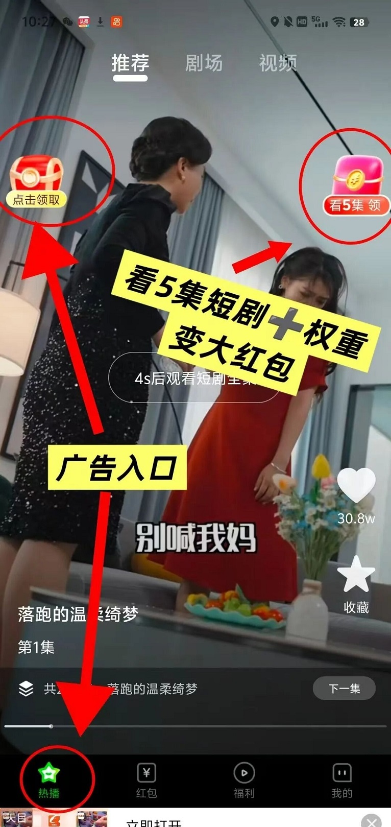 米多剧场金币获取主要来自四个模块,悬浮球、红包、邀请、解锁短剧。