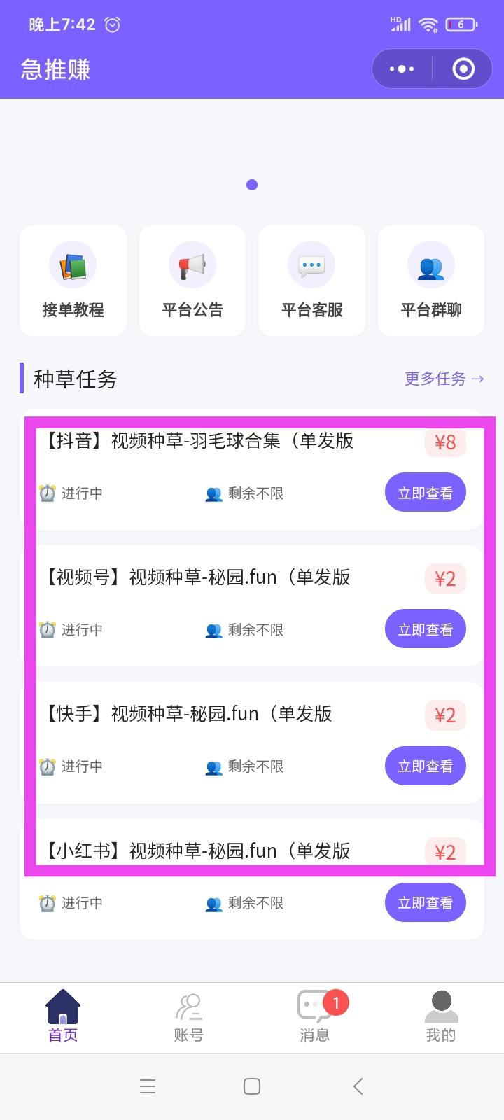 1、绑定唞音,把平台提供的种草视频发布到短视频平台即可,1分钟可完成。