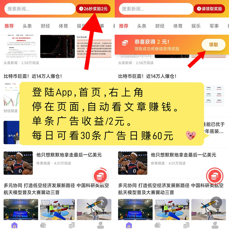 每条广告30秒,支持自动播放,无需手动干预,看完点"领取"即可得2元/条。每日可刷30次,单日封顶60元,完美利用碎片时间。
