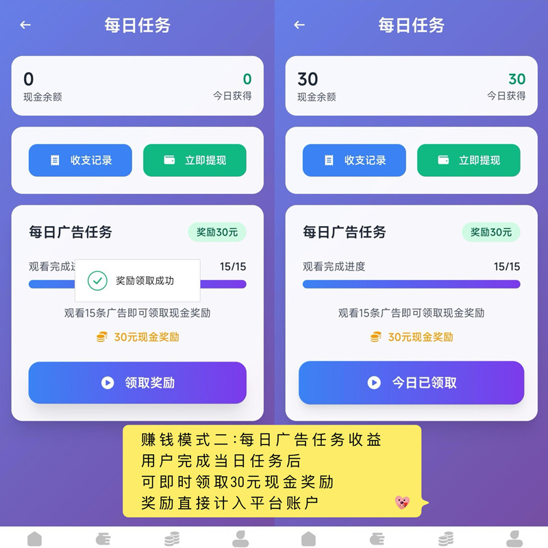 每日完成15条有效广告观看,立得30元现金。任务可分时完成,进度自动记录,防止重复操作,兼顾收益效率与灵活性。