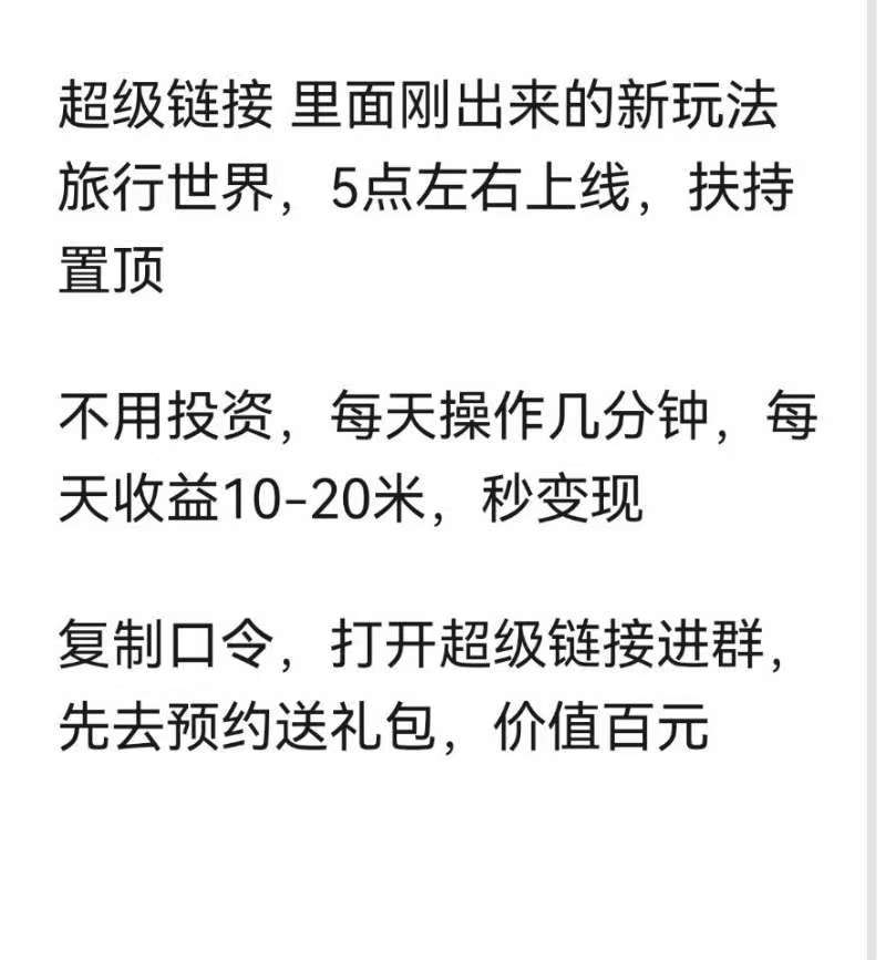正文 旅行时间看广告赚米,稳定收益!纯零撸,最强变现推荐! 魔熊 V评论者 /昨天 /0 评论 /92 阅读 1224 欢迎加入「旅行世界」官方玩家社群!这里是你获取最新玩法资讯,掌握玩法攻略,玩家心得交流的专属营地。入群首份福利。预约有礼预约通道今日17点正式开启!点击左下角「超级入口」进入[专属预约通道],预约越早,礼包越丰厚!复制口令,然后右上角添加群聊,然后左下角预约即可!分享的话,点击右上角三个点,复制自己的口令分享即可!未来连接又一神盘纯零撸 新橡木【旅行世界】图1输入口令:EE58DC83图2大家尽快去预约,越早预约礼包越大投诉/删帖