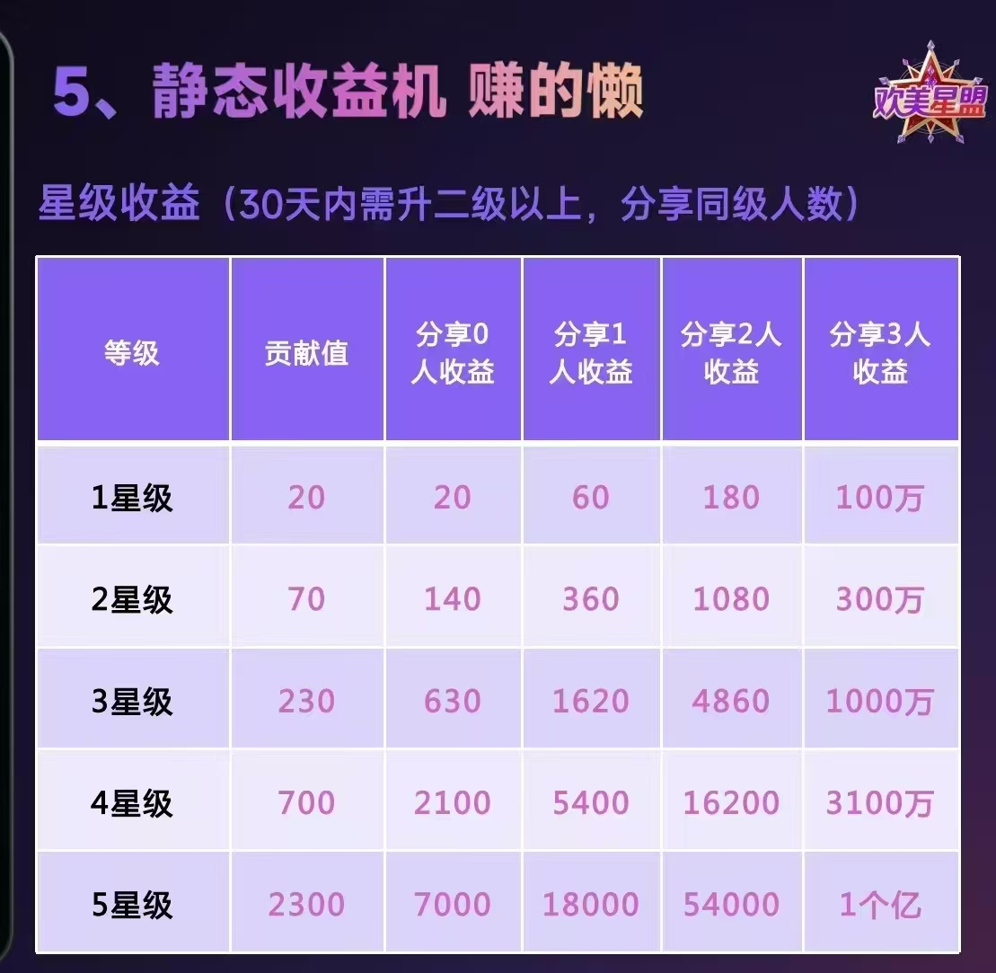 成为一星后就可以获得下面20层会员的捐赠。网体里如果有10万人。你就能获得10W.