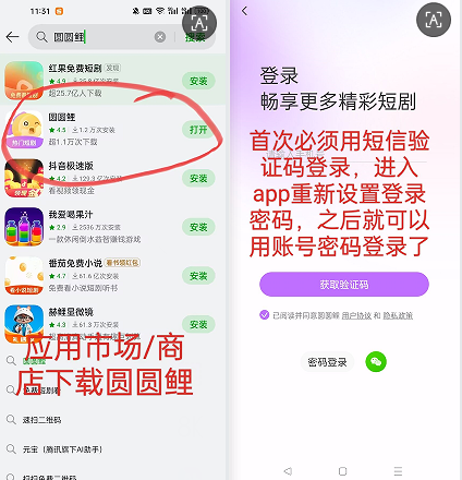 第二步,打开手机应用市场商店,搜索圆圆鲤,下载安装。