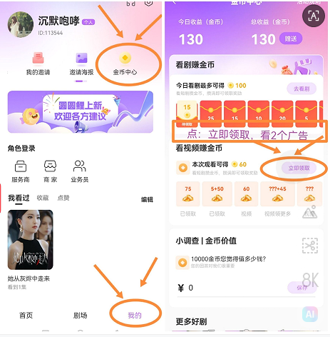 第三步,看短剧三分钟,或者立即领取看2个视頻,只要积累100金b,都是完成任务