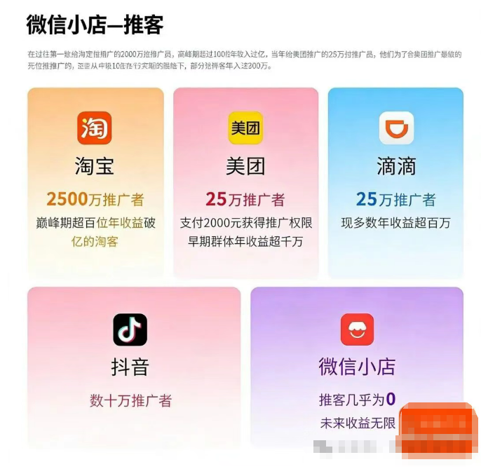 举个简单的例子,我们在微信群里,是不是看到过淘口令,美团券,滴滴券,等等,那么推广淘宝的叫淘客,推广抖音的叫抖客,推广京东的叫京东客,那么推广微信小店的叫微信推客。