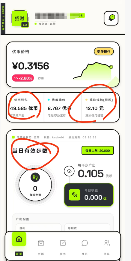 平台提供多种任务,包括领取小白鞋、签到、团队加成等,完成后获得优币。优币不仅可以兑换现琻,还可以质押产生优卷,用于购置更/多新产品。