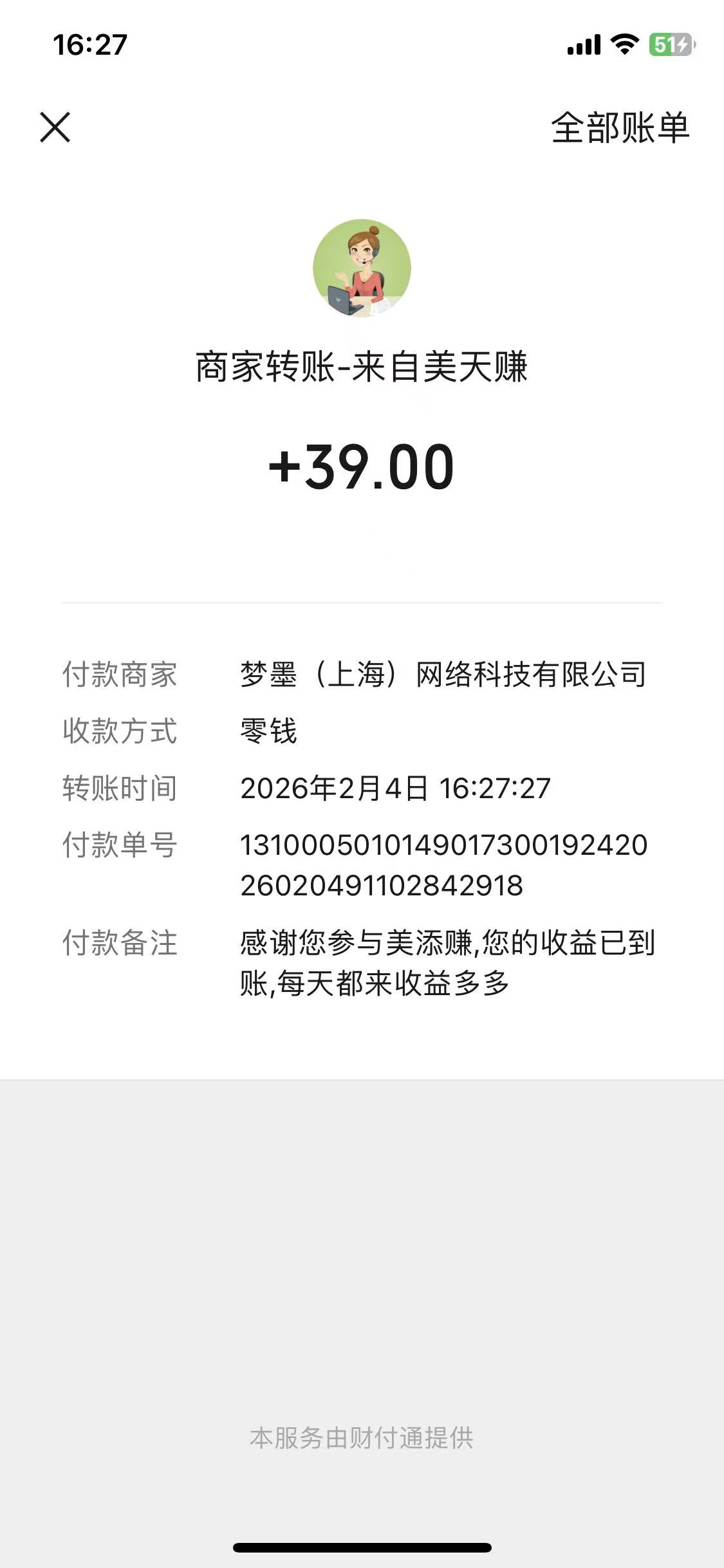 美添赚是专注微信生态的任务变现平台,核心玩法围绕阅读文章、关注公众号、点赞内容三类任务展开。用户完成指定动作获取积分,折算后日收益稳定在3-5元区间。平台支持多账号积分归集至统一账户提现,该机制降低了小额分散的管理成本。