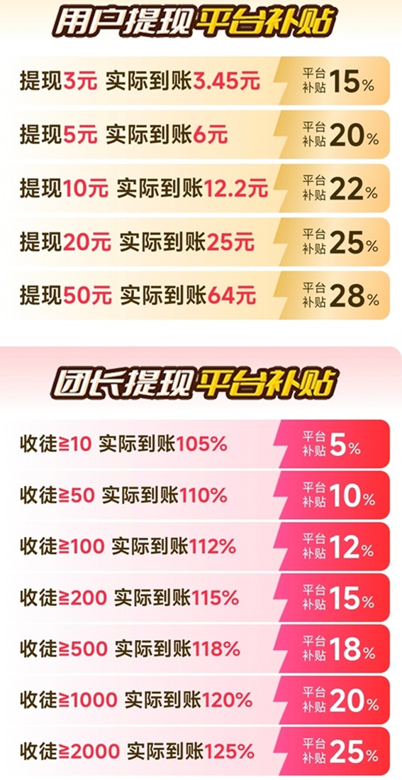 团长提现平台补贴,收徒≥10实际到账105%,收徒≥50实际到账110%,收徒≥100实际到账112%,收徒≥200实际到账115%,收徒≥500实际到账118%,收徒≥1000实际到账120%,收徒≥2000实际到账125%。