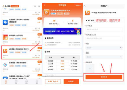 第一步,开通专属推广入口。首先下载「UC浏览器」APP,再通过【蜂小推】公众号菜单栏下载【蜂小推】app完成账号注册,随后在首页找到UC网盘项目后,复制项目详情页链接至UC浏览器打开完成签约绑定,同时复制该页面UID并将绑定成功页面截图备用;返回【蜂小推】app点击项目详情页下方的申请推广,填写UID和相关信息并上传绑定成功截图,随后提交申请。