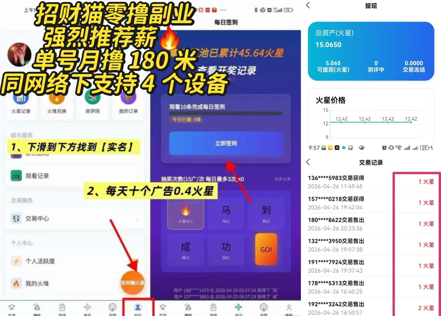 玩法:注册实名然后首页看10个广告得0.4火星价值5元,新用户满5个可以试卖一个,10个以上提现不限制,新用户复投后5个以上部分都可以卖。