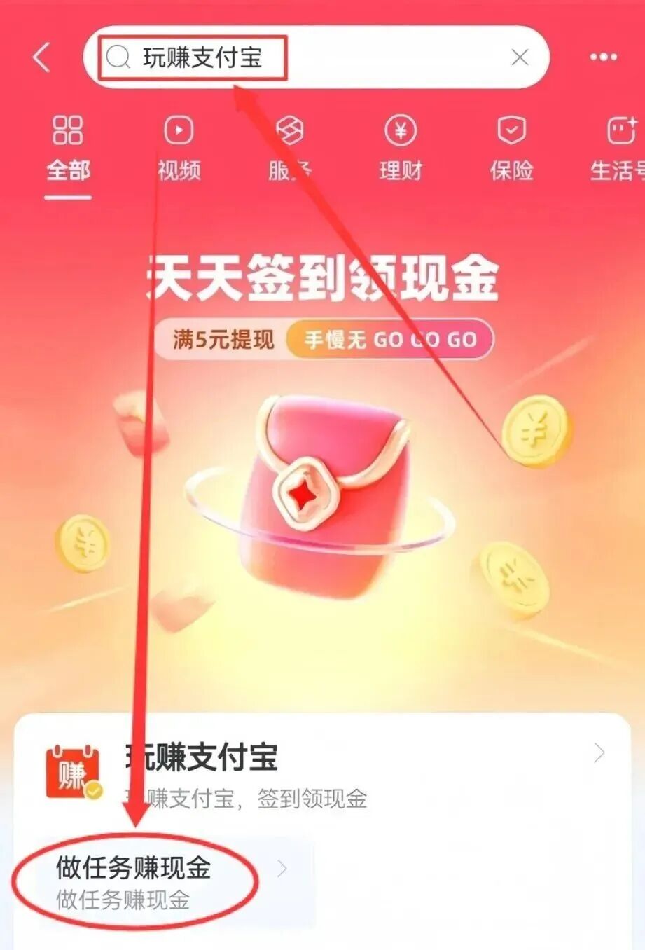 打开支付宝,在顶部搜索框输入:“玩赚支付宝”