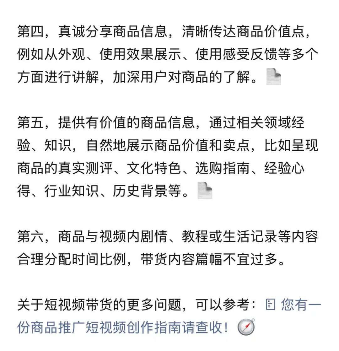 这些点其实也是短视频容易违规限流的点,所以我建议所有人都去看一下8月21号发的这条短视频带货的六条干货建议,甚至下面还附赠了一份短视频的创作指南
