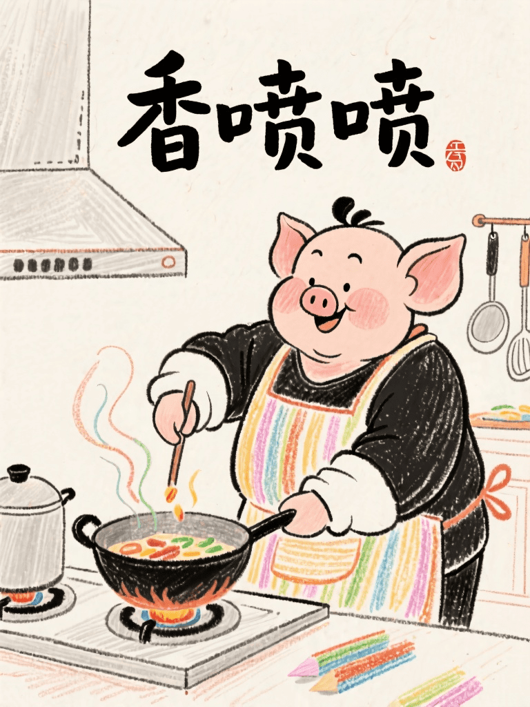 彩色铅笔手绘风格,胖乎乎的八戒围围裙在厨房炒菜,彩铅涂色不完全填满showing纹理,锅里热气用弯曲线条表现,厨房用具用简单几笔勾勒,色彩温暖但有留白,手绘质感明显,素描纸纹理,手写文字"香喷喷"