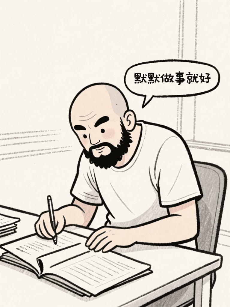 简笔画漫画风格,沙僧光头胡须穿简单T恤,埋头整理桌上文件,线条简洁但有感情,背景用几根线条暗示办公环境,重点突出人物动作,留白较多,铅笔淡淡涂抹表现阴影,手绘对话泡"默默做事就好"