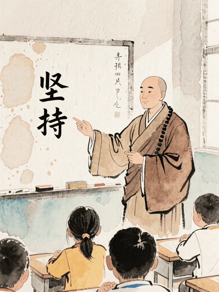 水彩淡彩风格,现代装扮的唐僧给学生讲课,水彩颜料自然晕开边缘,铅笔打底稿痕迹隐约可见,人物表情温和用寥寥几笔表现,背景教室用淡彩一笔带过,水渍效果自然,纸张纹理明显,手写板书"坚持"