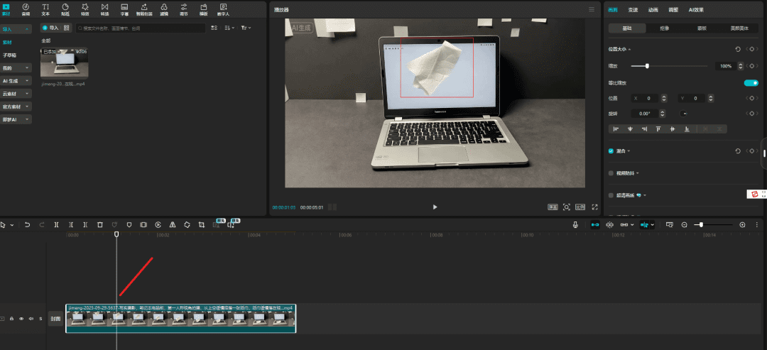 3.看看效果。第二步,剪映导出静帧图片1.打开剪映,导入上一步生成的视频,找到纸巾刚好落在画面中央的那一帧。