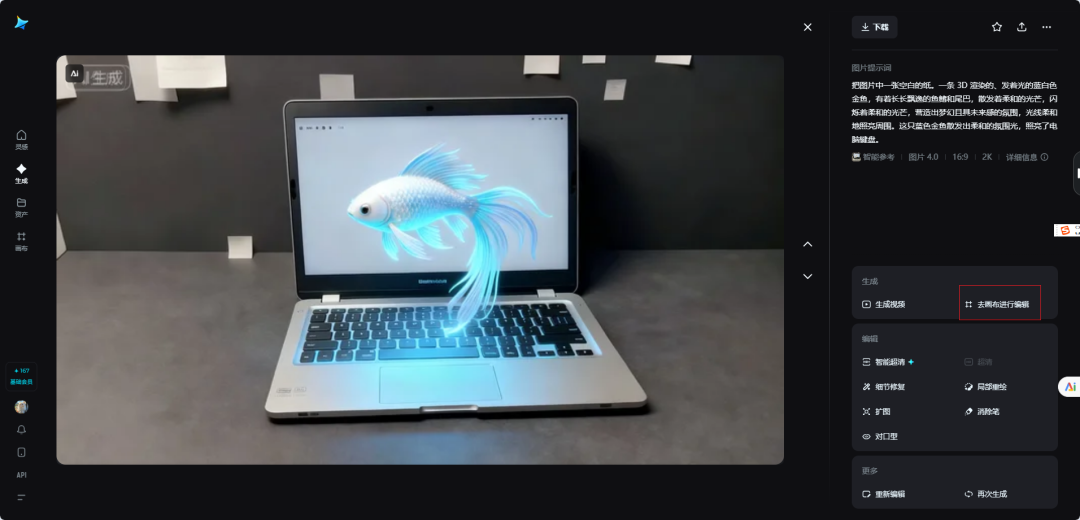 -输入提示词:把图片中一张空白的纸,变成一条3D渲染的、发着光的蓝白色金鱼,有着长长飘逸的鱼鳍和尾巴,散发着柔和的光芒,营造出梦幻且具未来感的氛围,光线柔和地照亮周围电脑键盘。