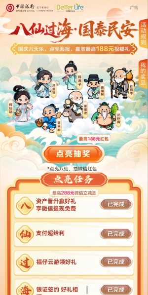 正文 中国银行八仙过海国泰民安,抽最高188元微信红包 首码推荐 V管理员 /今天 /166 阅读 1003 中国银行举办的八仙过海国泰民安简单浏览抽最高188元红包活动,打开微信进去活动里,完成页面所有的任务就可以抽奖1次,除了第1个任务是报名任务,其他所有任务都是浏览任务,有机会中到随机金额的微信红包,小编测试中到0.32元红包秒推。 微信扫下面码进入活动: 活动时间:2025年10月1日-10月8日 进入活动页面完成几个简单的任务点亮抽奖,除了第1个任务是报名任务,其他所有任务都是浏览任务,刚中0.32元。 投诉/删帖