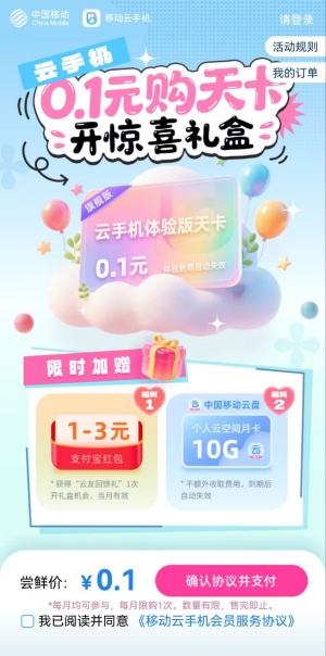 正文 云手机支付0.1元抽1-3元支付宝红包,亲测中3元 首码推荐 V管理员 /昨天 /158 阅读 1006 移动云手机举办的0.1元购天卡开惊喜礼盒抽最高3元支付宝红包活动,打开微信进去活动里,登陆后支付0.1元购买天卡就可以抽奖1次,有机会中到1-3元支付宝红包,小编测试中到3元,这个活动全国三网手机号码都可以去。 微信扫下面码进入活动: 活动时间:结束日期未知 进入活动页面登陆后支付0.1元抽1-3元支付宝红包,刚中3元,目前有点卡,全国三网手机号码都可以去。 投诉/删帖
