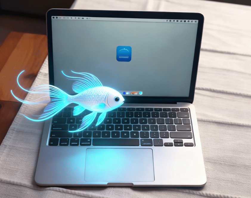 把图片中的纸巾一条发着荧光的蓝白色金鱼,鱼有着飘逸的鱼鳍和尾巴,在电脑前来回游动,3D渲染效果,营造出梦幻且具未来感的氛围,光线柔和地照亮周围的笔记本电脑。