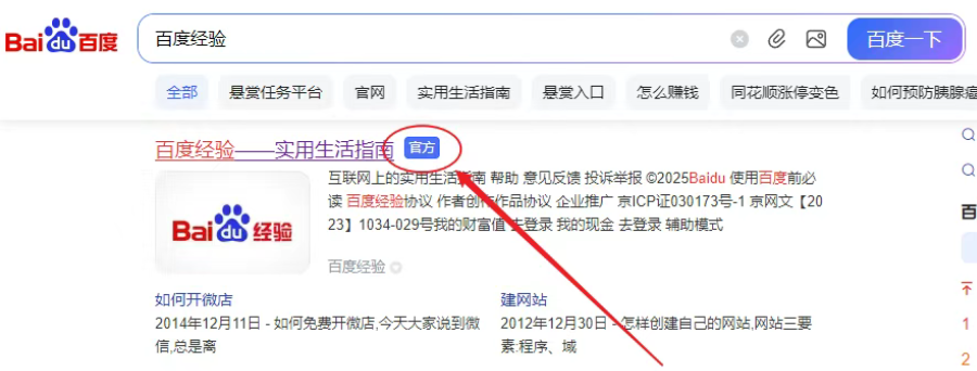 玩法流程也很简单,首先在百度搜索“百度经验”,找到带有官方标识的页面。