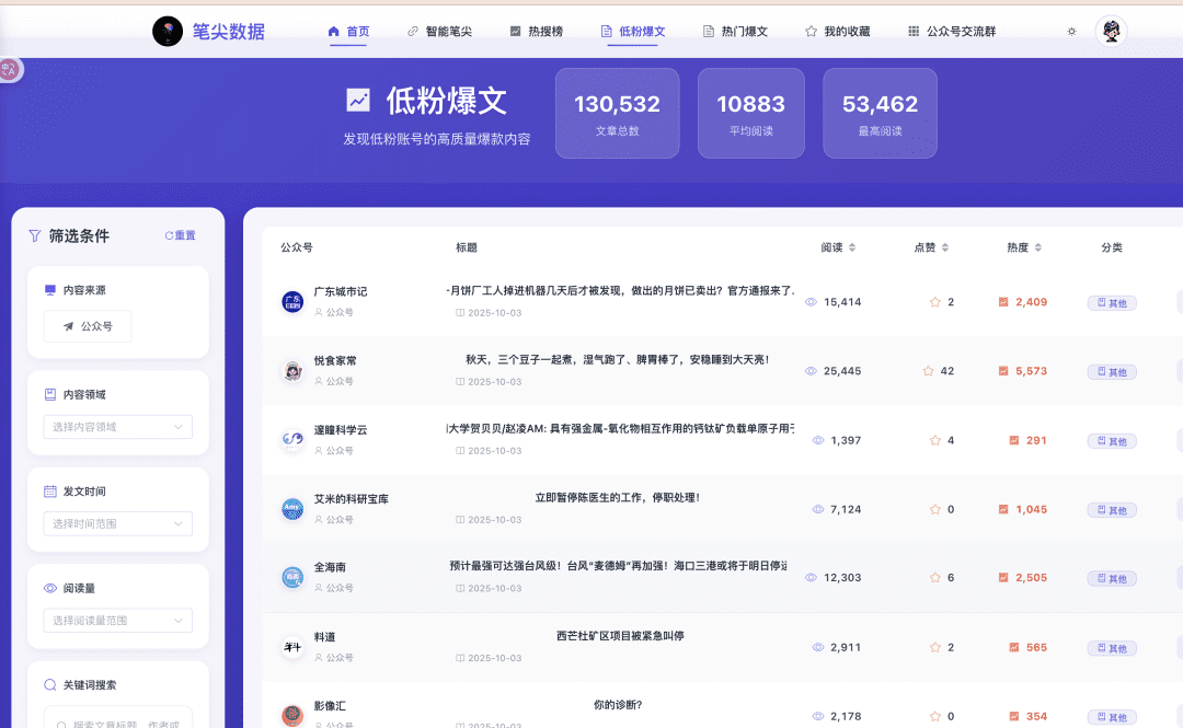 笔尖数据——爆文平台【免费】——每日更新低粉爆文,10W+爆文,主流平台热点实时采集。