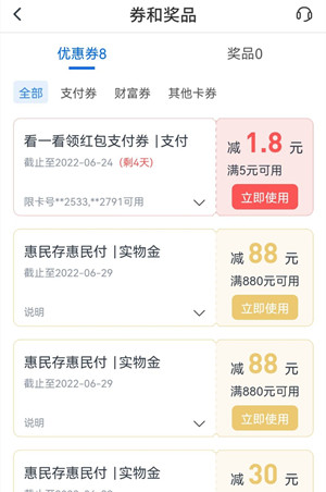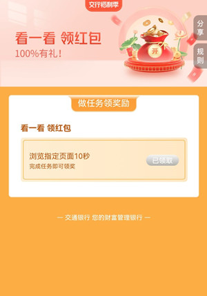交通银行举办的微信小程序幸运大转盘抽最高18元红包活动,打开微信进去交通交通银行小程序,点横幅【幸运大转盘】进去报名抽奖,必中1-18元支付券红包,小编测试刚中到2元,得到的支付券可以在交通银行APP付款的时候抵扣使用,也可以扫银联商家码变现。