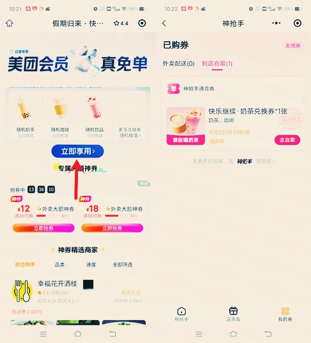 正文 美团开工日免费领奶茶免单券、冰淇淋免单券 首码推荐 V管理员 /昨天 /175 阅读 1009 美团举办的开工日领奶茶免单券活动,打开美团APP、或者微信进去小程序活动里,进去点【立即享用】直接领奶茶免单券、冰淇淋免单券,领到免单券后到店核销就可以0元喝奶茶、0元吃冰淇淋,多号可多撸。 微信扫下面码进入活动: 活动时间:2025年10月8日-结束时间未知 进入活动页面进去点【立即享用】直接领奶茶免单券、冰淇淋免单券。 投诉/删帖