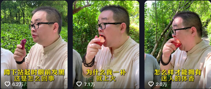 视频制作形势很简单,就是一个人物拿着一个东西在吃,然后加上文案配音就搞定了。