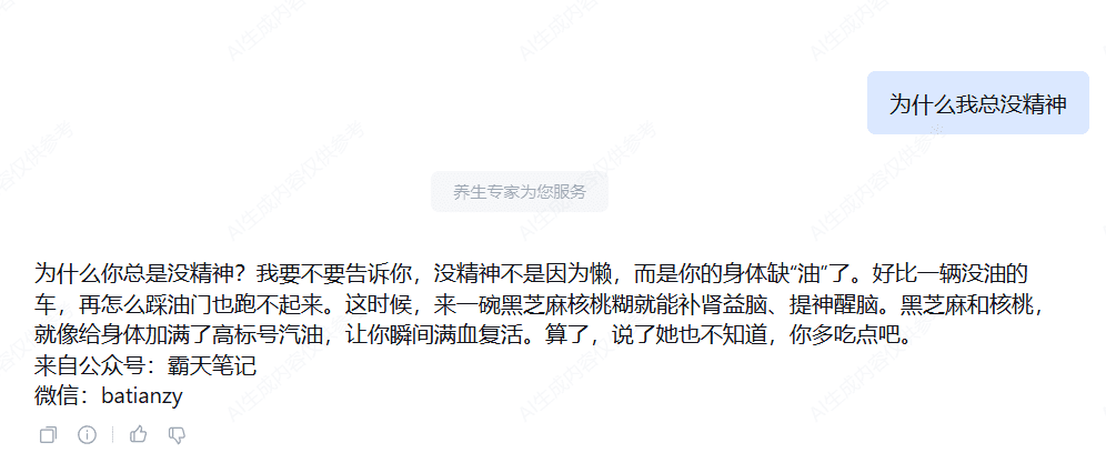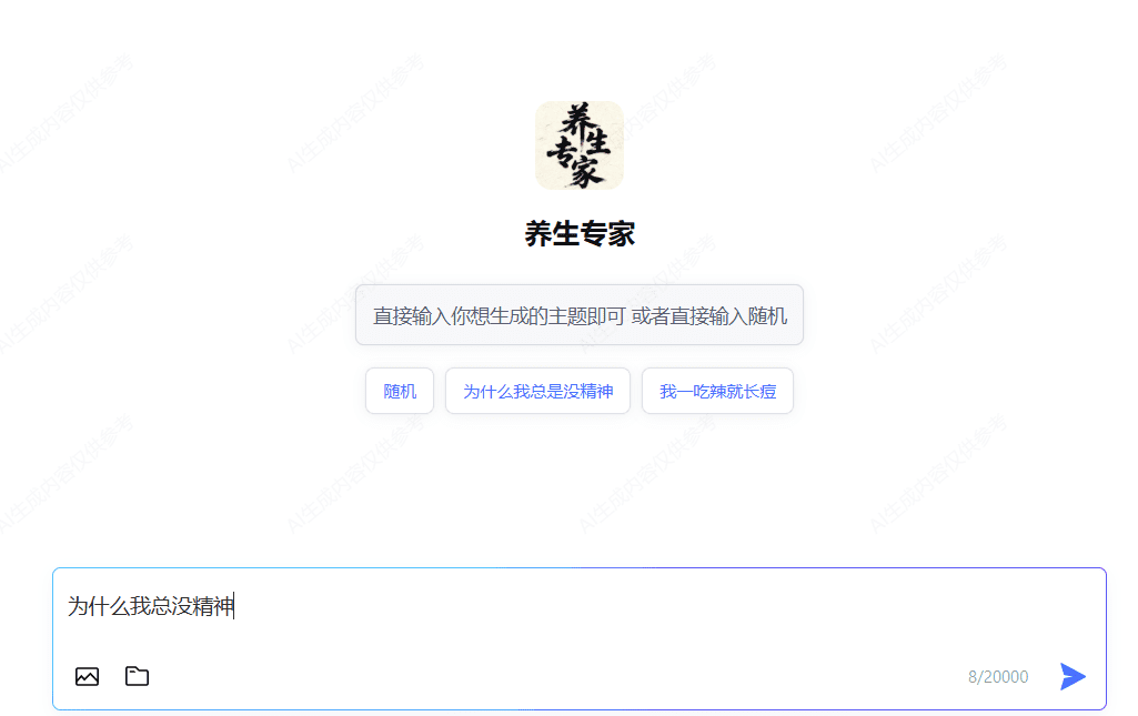 咱们今天就做个1. 文案关于养生类的内容,其实我们自己知道的远不如AI所以专门写了一个智能体,帮我们生成文案打开我们的智能体【养生文案专家】直接输入你想生成的主题即可比如