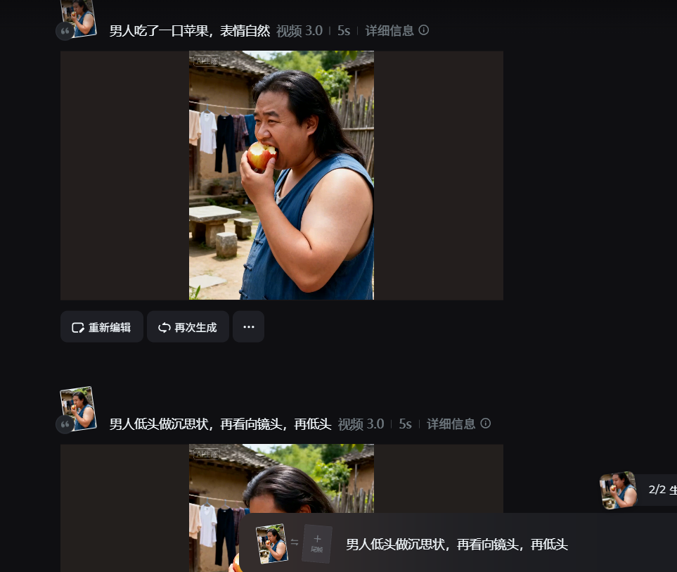 3. 图生视频依然使用即梦AI选择视频生成功能,模型3.0,上传你生成好的图片生成一个吃东西的视频,提示词:男人咬了一口手中的苹果,自然真实再生成一个做思考状的视频,提示词:男人低头做沉思状,再看向镜头,再低头