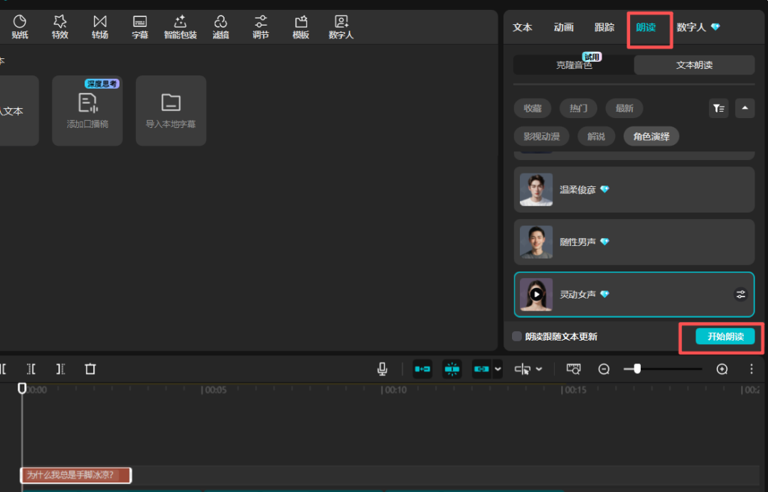 4. 视频合成将视频导入剪映里面同时新建文本,第一句话是个女孩说的,先给这段文字进行配音
