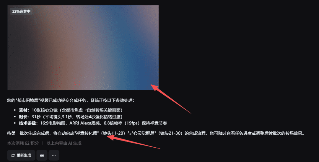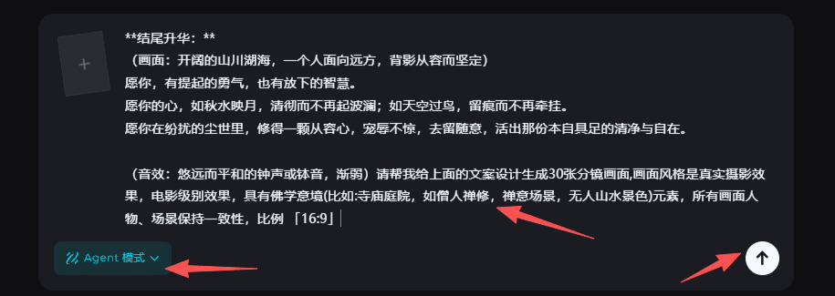 打开即梦,打开agent模式输入口令词:xxx(代表文案),请帮我给上面的文案设计生成30张分镜画面,画面风格是真实摄影效果,电影级别效果,具有佛学意境(比如:寺庙庭院,如僧人禅修,禅意场景,无人山水景色)元素,所有画面人物、场景保持一致性,比例 「16:9」