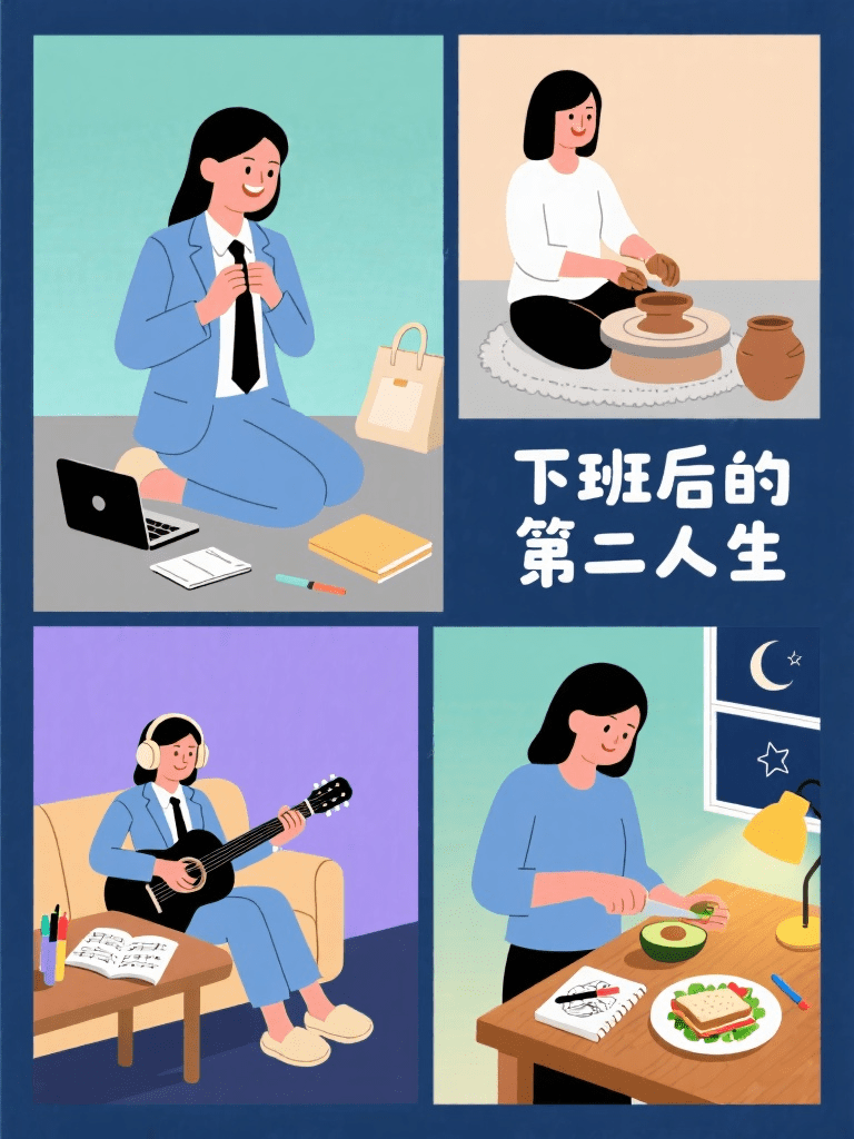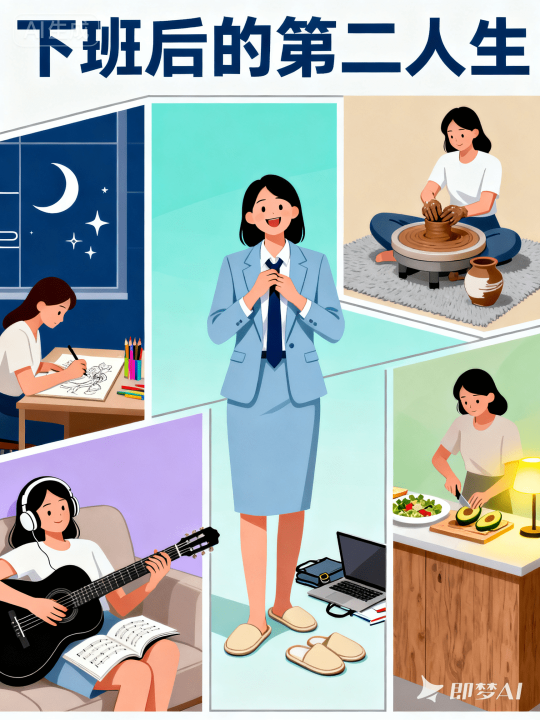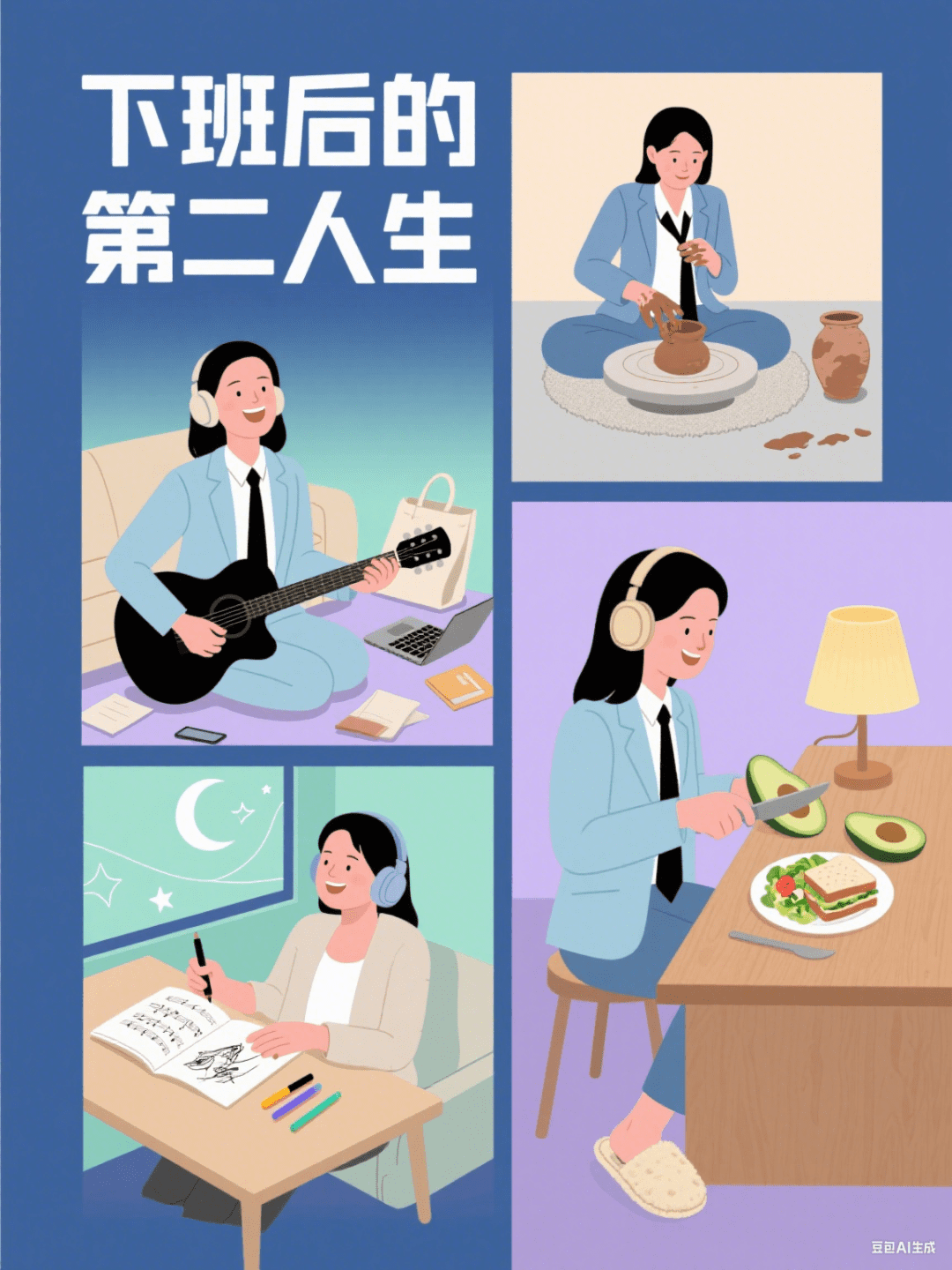 扁平插画海报。分镜式形式,主标题“下班后的第二人生”包括主视觉场景1:画面中心位置,穿浅蓝通勤西装的亚洲女性正解开领带,嘴角带笑,身旁散落着笔记本电脑和文件袋,地面有一双刚换上的米色棉拖,背景为淡青色渐变区块。场景2:右上角小分镜,女性盘腿坐在浅灰色地毯上,面前摆着打开的陶艺转盘,双手沾着棕色陶泥正在塑形,旁侧放着半完成的陶罐,背景为暖米色纯色块。场景3:左下角小分镜,女性戴着耳机靠在沙发上,指尖在黑色吉他弦上轻按,腿上放着翻开的乐谱,背景为浅紫色纯色块。场景4:右侧中间分镜,女性在原木色料理台前切牛油果,旁边的白色餐盘里摆着沙拉和三明治,台面上的小台灯发出暖黄色微光,背景为淡绿色渐变区块。场景5:左侧中间分镜,女性坐在书桌前用马克笔绘画,桌面上铺着速写本和彩色马克笔,窗外有月牙和星星的简化线条图案,背景为深蓝色纯色块。采用简约几何色块风格,以浅青、暖米、浅紫、淡绿、深蓝为5种主色调,所有元素均为哑光质感。构图特征: 中心主场景+四周分镜环绕布局,各场景间用细灰色线条分隔,视觉焦点集中于中心人物的状态转变,整体元素密度适中,留白充足。整体具有商业插画质感。
