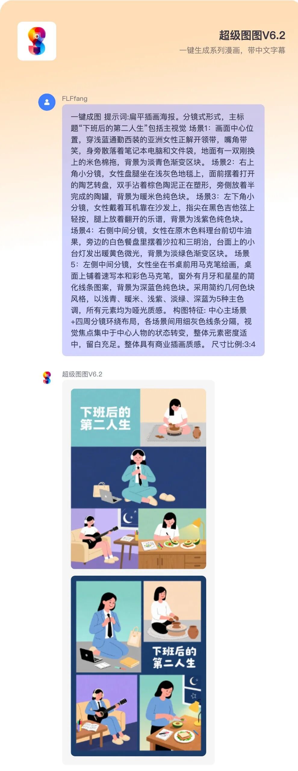 我输入的是“下班后的第二人生”,豆包给到我的图片提示词: