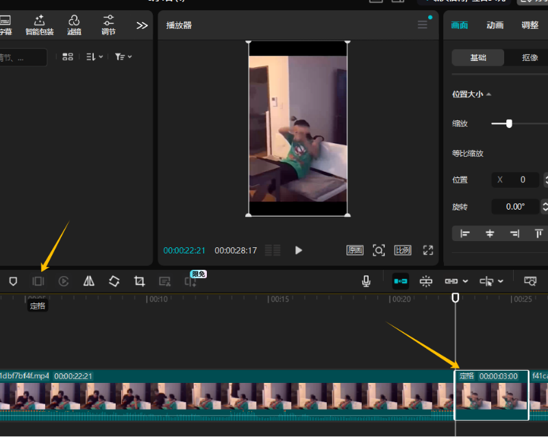 下载好视频之后咱们打开剪映,找到搞笑的画面,选中点击定格。