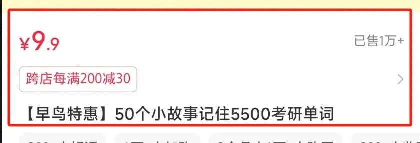 也难怪这里有考研单词有1万的销量,可见需求很旺盛,光这一个资料,博主纯利润就是10万,在平台卖虚拟资料赚10万+的不少,但是用这个故事的形式被单词的还很少见,这个思路很有意思,我们可以举一反三,把这个玩法用在其他资料上。