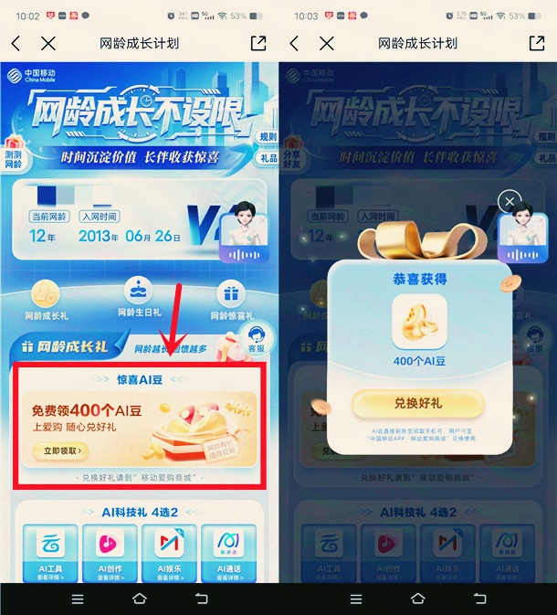 正文 中国移动网龄礼领AI豆,兑换5-20元手机话费 首码推荐 V管理员 /昨天 /164 阅读 1011 中国移动举办的网龄成长礼领AI豆活动,打开“中国移动”APP搜索【网龄礼】进去领随机AI豆,一般都有几百个豆,然后再去话费兑换页面,用AI豆兑换5-20元手机话费,兑换后话费秒到账。 活动时间:结束日期未知 活动流程: 1、打开“中国移动”APP搜索【网龄礼】进去领随机AI豆,一般都有几百个豆 2、手机扫描下面二维码,点【话费兑换】进去,用AI豆兑换5-20元手机话费秒到 投诉/删帖