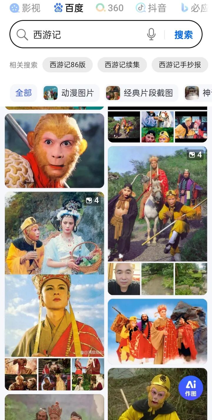 我留意到这个赛道后,专门产出保姆ji教程,从操作细节到提示词逐一说明,即便是小白10分钟也可以学明白。一、选定《西游记》人物首先要做的是搜集86版《西游记》人物角色素材,相对“笨”但实用的方法是:打开百度,搜索关键词“西游记”。接着在搜索出的图片里,筛选出孙悟空、唐僧、观音等核心人物的对应图片即可。